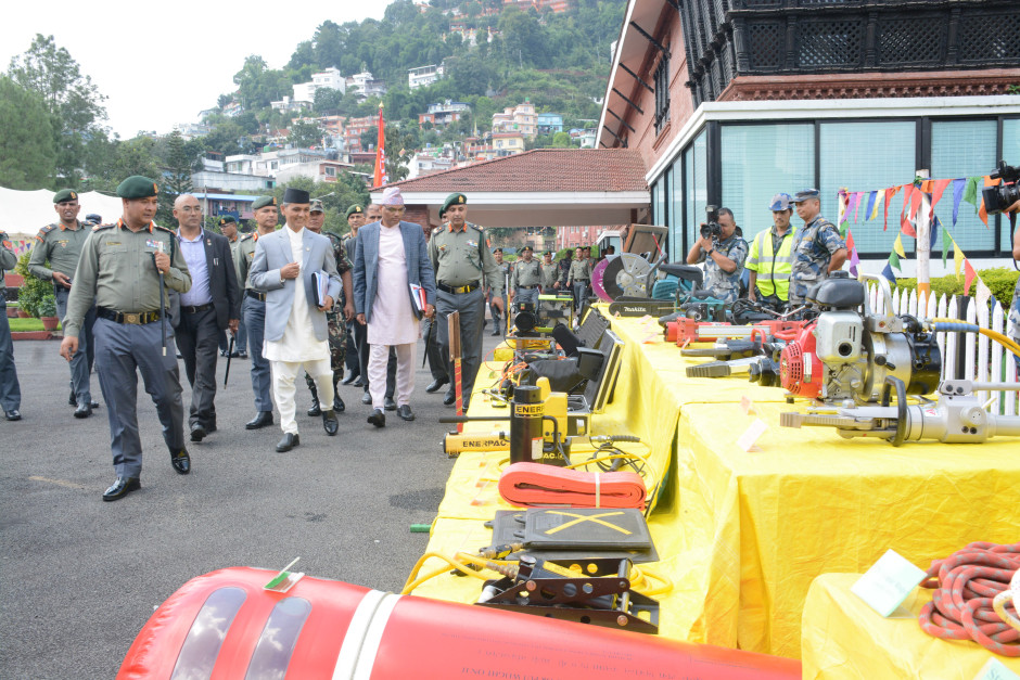 गृहमन्त्री ओमप्रकाश अर्यालज्यूबाट सशस्त्र प्रहरी बल प्रधान कार्यालय, हल्चोक, काठमाडौँ, पुगेर स्थलगत निरीक्षण पछि खिचिएको सामुहिक तस्बिर
