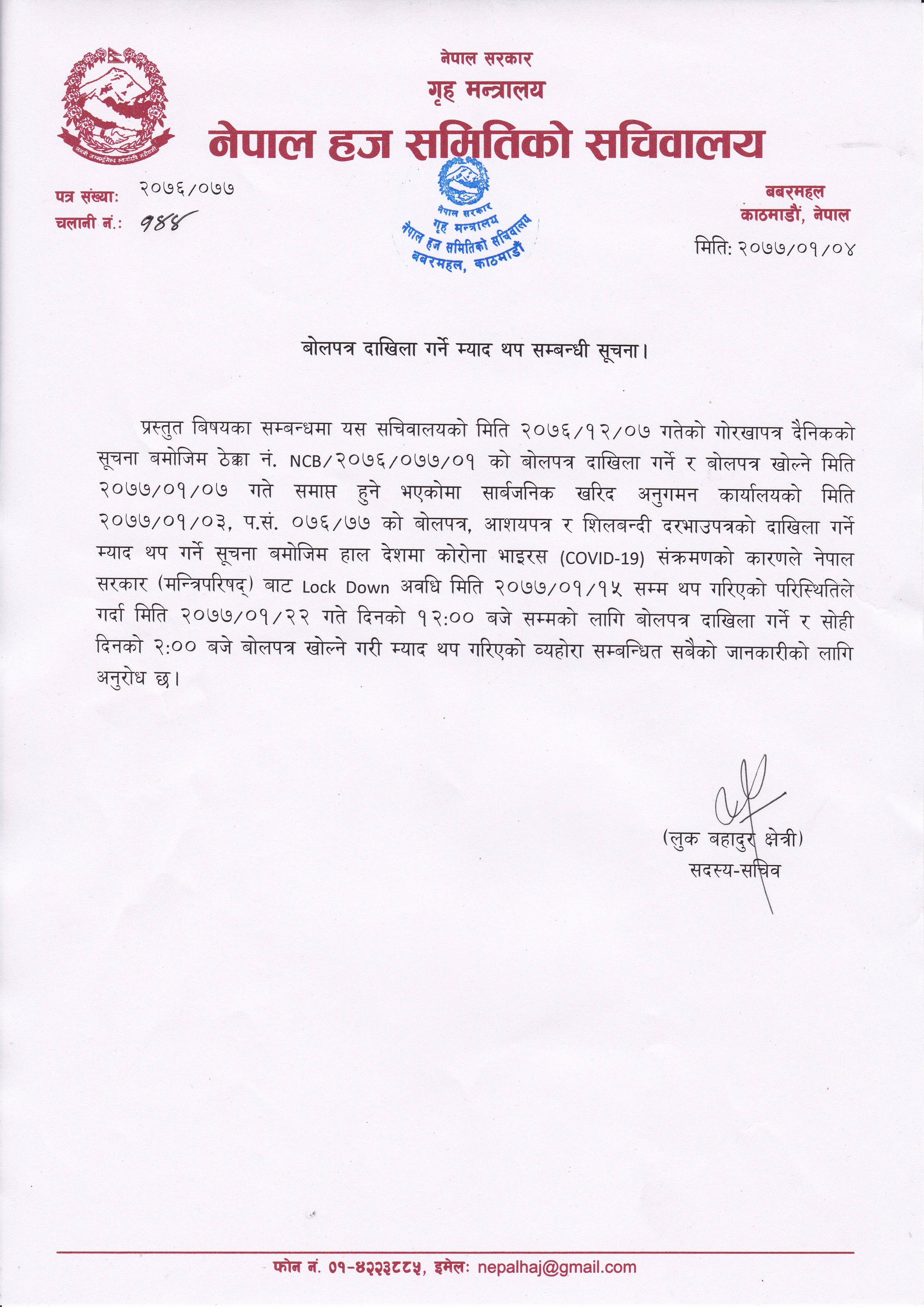 बोलपत्र दाखिला गर्ने म्याद सम्बन्धी सूचना