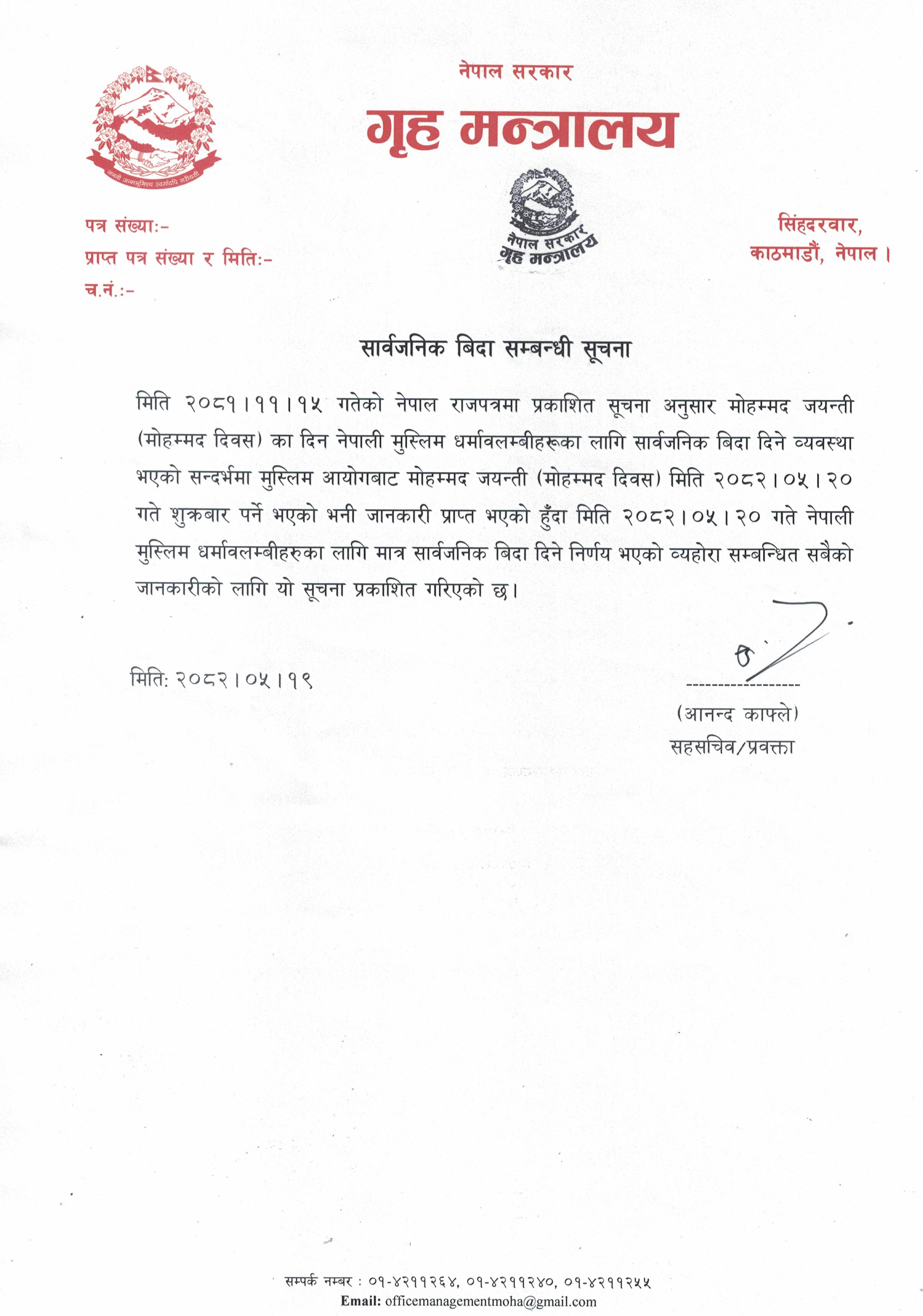 सार्वजिनक विदा सम्बन्धी सुचना 2082-05-19