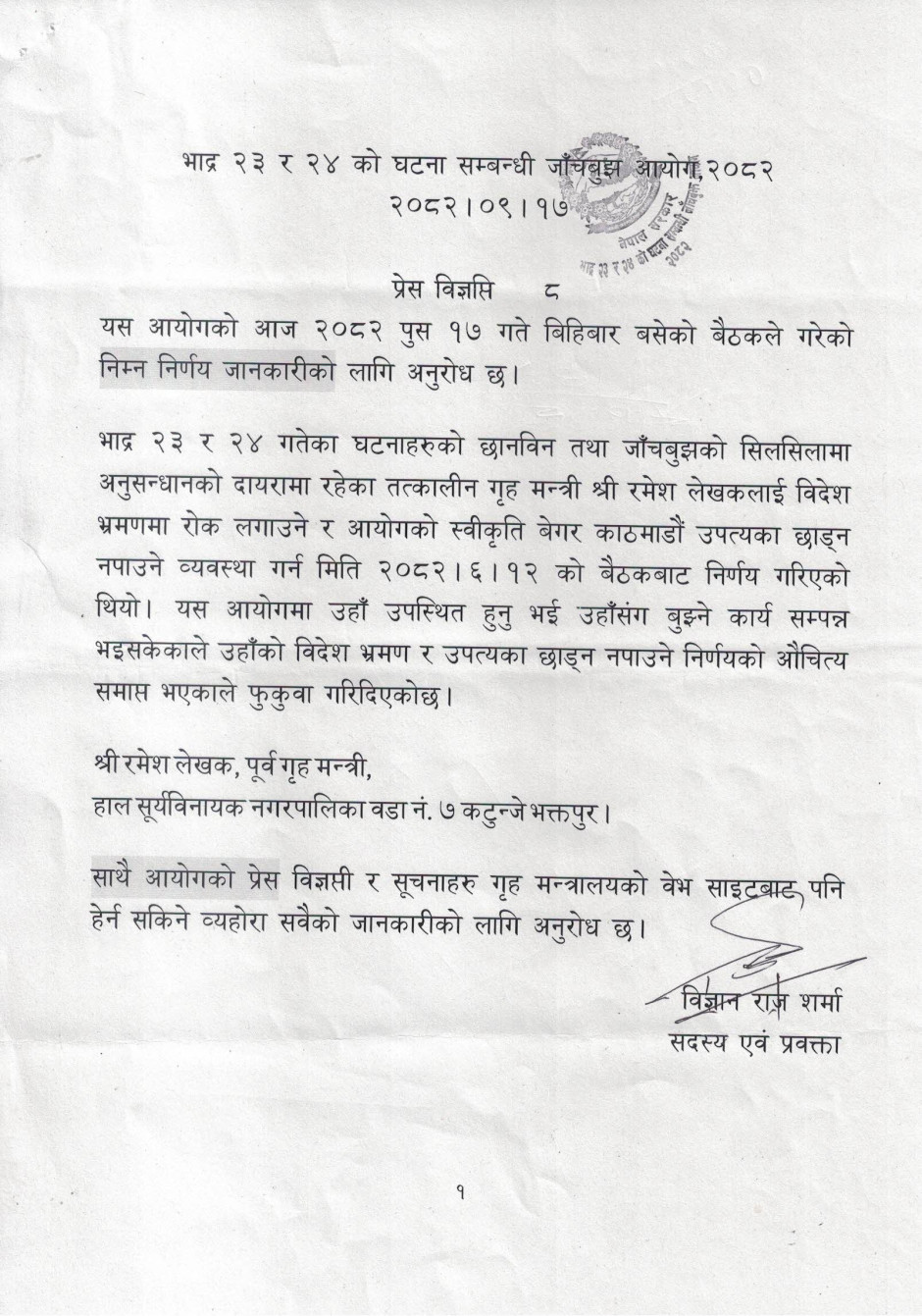 भाद्र २३ र २४ को घटना सम्बन्धी जाँचबुझ आयोग, २०८२ को प्रेस विज्ञप्ति