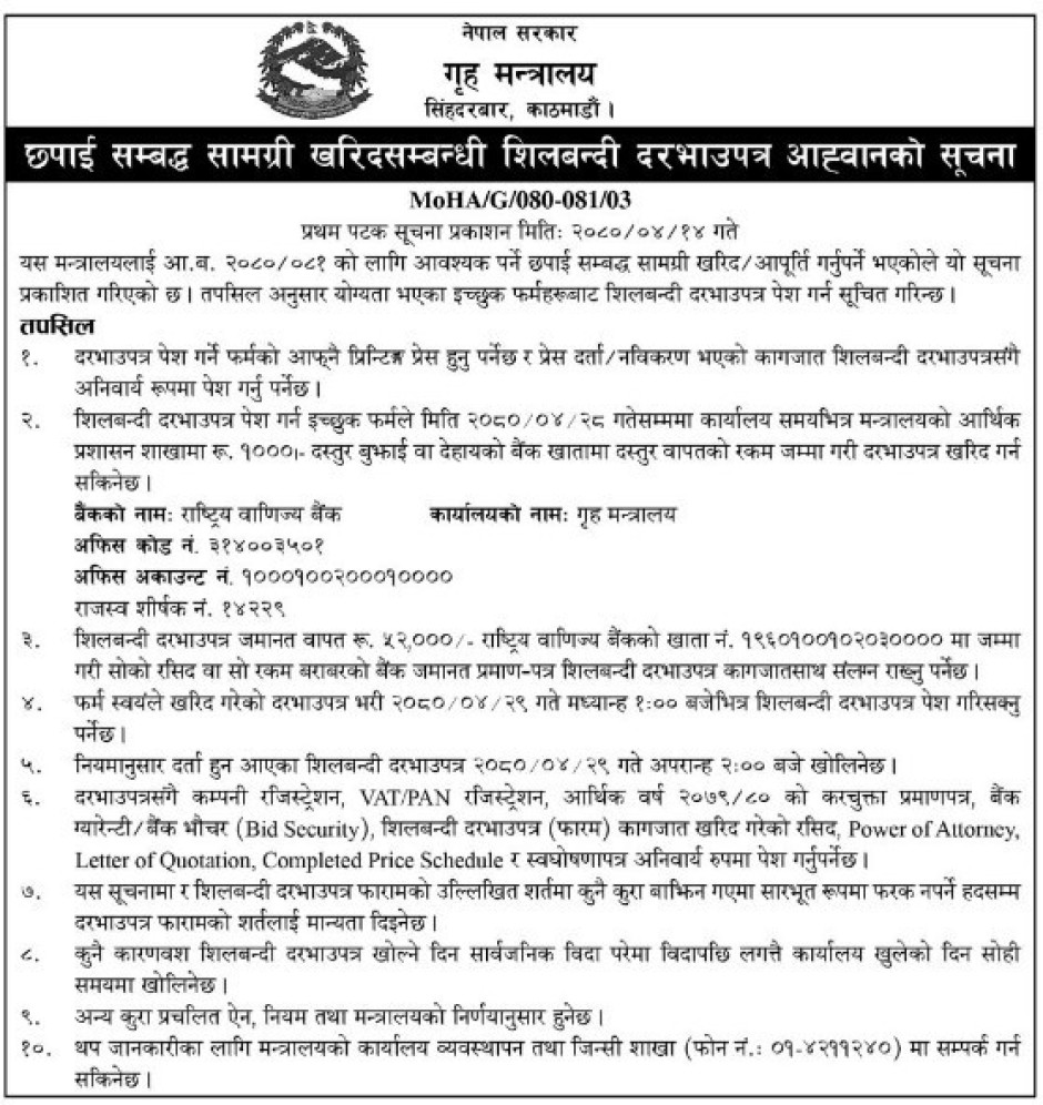 छपाई सम्बद्ध सामग्री खरिदसम्बन्धी शिलबन्दी दरभाउपत्र आव्हानको सूचना