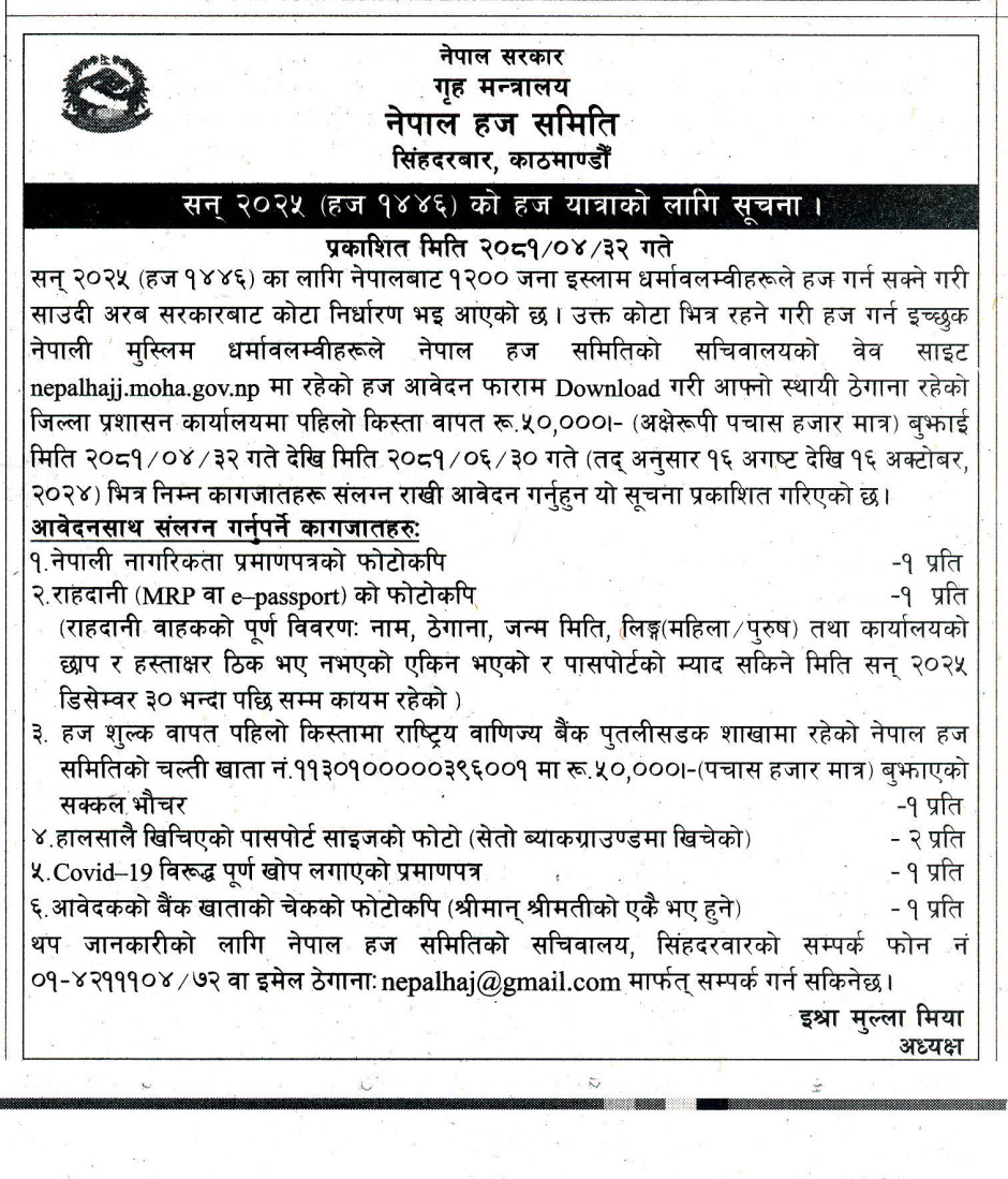 सन् २०२५ को हजको लागि आवेदन गर्ने सम्बन्धी सूचना