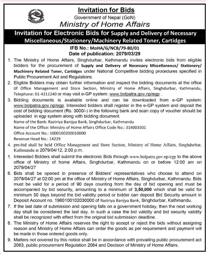 Supply and Delivery of Stationery and Miscellaneous Goods खरिद सम्बन्धी बोलपत्र आव्हानको सूचना
