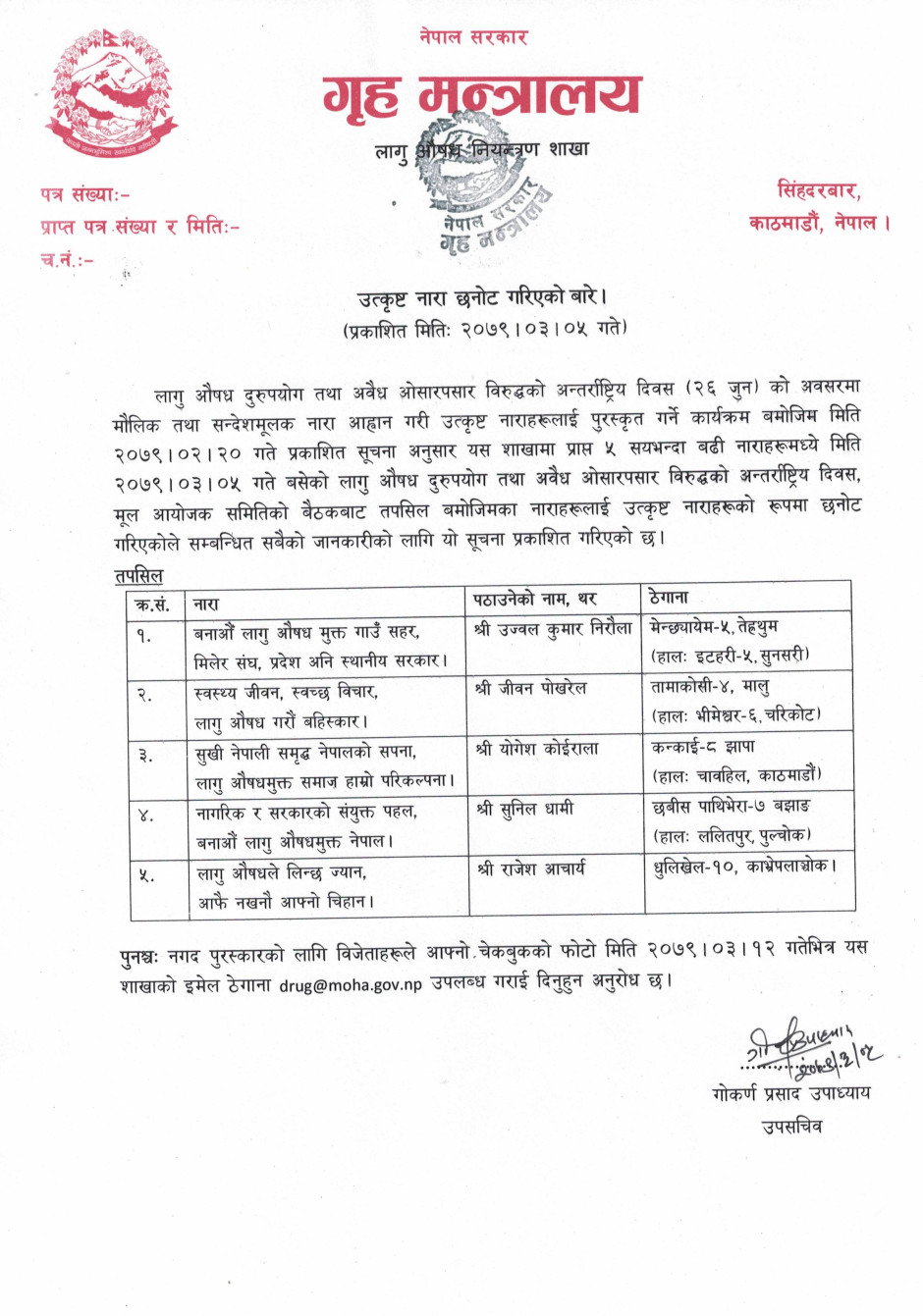 लागुऔषध सम्बन्धी उत्कृष्ट नारा छनोट गरिएको सम्बन्धी सूचना ।