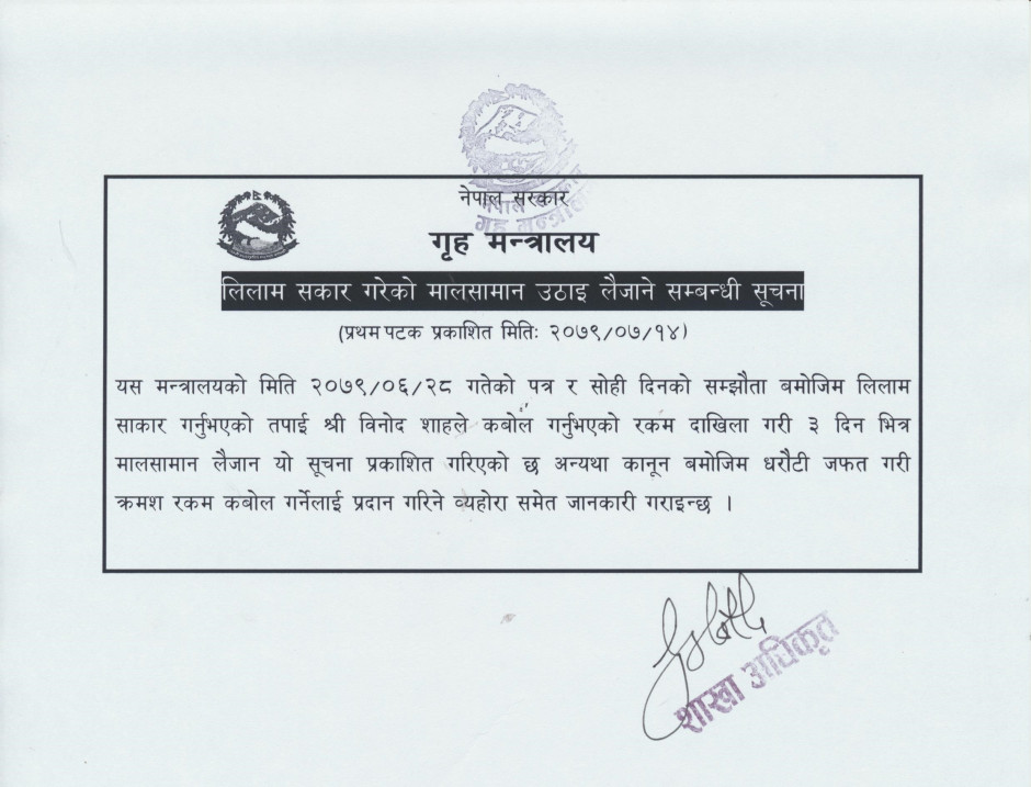 लिलाम सकार गरेको मालसामान उठाइ लैजाने सम्बन्धी सूचना