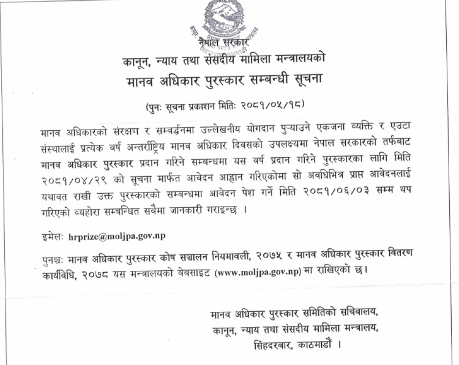 पुरस्कारको लागि आवेदन पेश गर्ने सम्बन्धी सूचना
