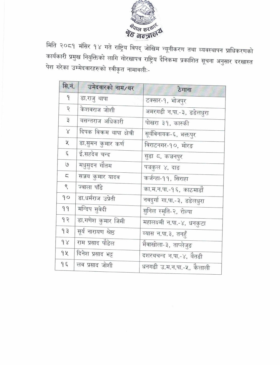 मिति 2081 मंसिर 14 गते राष्ट्रिय विपद् जोखिम न्यूनीकरण तथा व्यवस्थापन प्राधिकरणको कार्यकारी प्रमुख नियुक्तिको लागि गोरखापत्र राष्ट्रिय दैनिकमा प्रकाशित सूचना अनुसार दरखास्त पेश गरेका उम्मेदवारहरुको स्वीकृत नामावलीः-