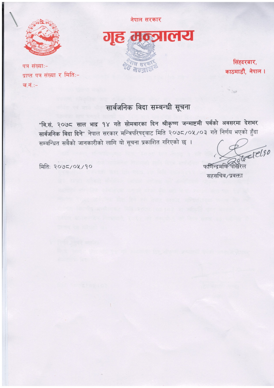 सार्वजनिक बिदा सम्बन्धी सूचना