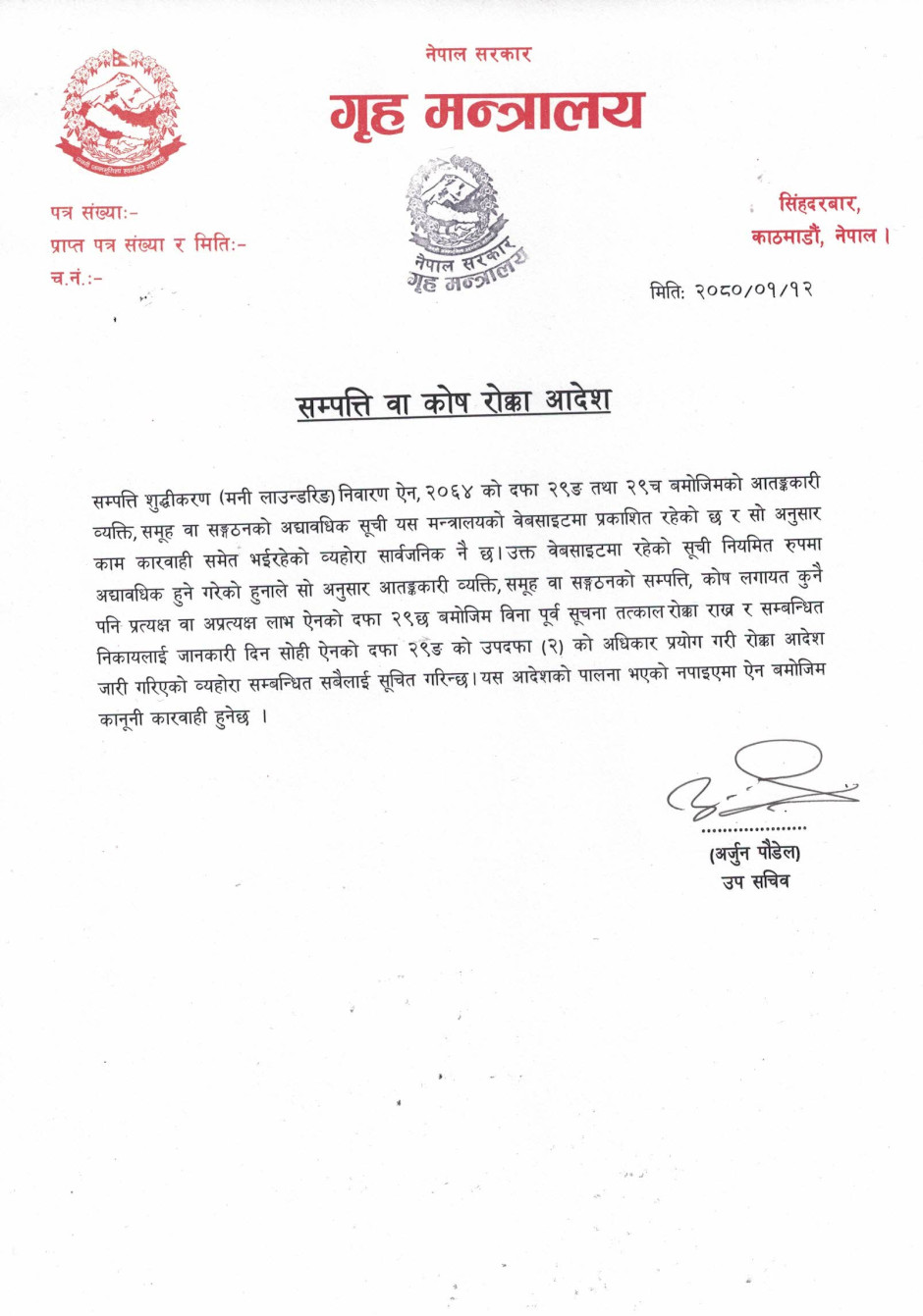सम्पत्ति वा कोष रोक्का आदेश (मार्च २०२६ सम्म)