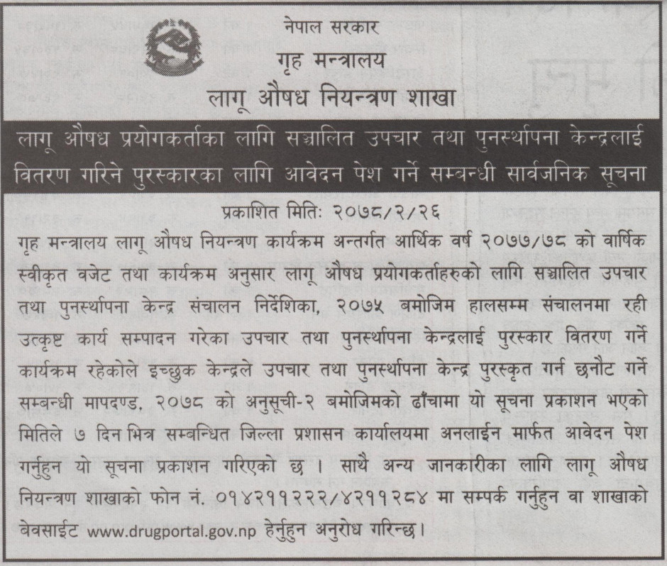 लागू औषध प्रयोगकर्ताका लागि सञ्चालित उपचार तथा पुनर्स्थापना केन्द्रलाई वितरण गरिने पुरस्कारका लागि आवेदन पेश गर्ने सम्बन्धि सार्वजनिक सूचना
