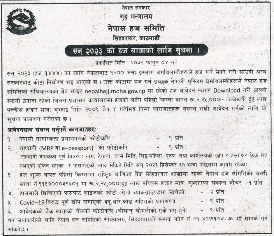 सन् २०२३ को हज यात्राको लागि सूचना।