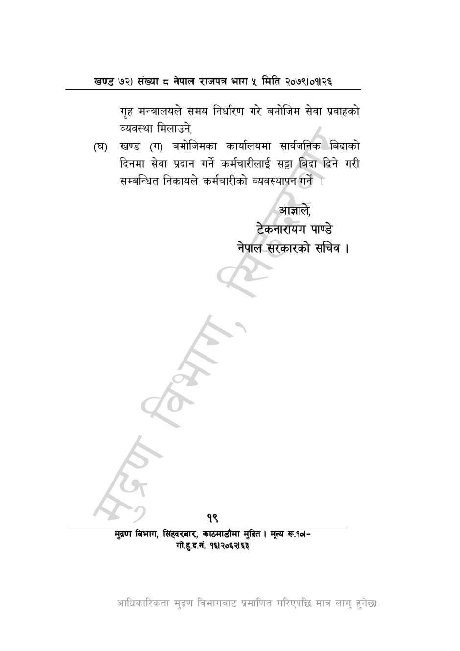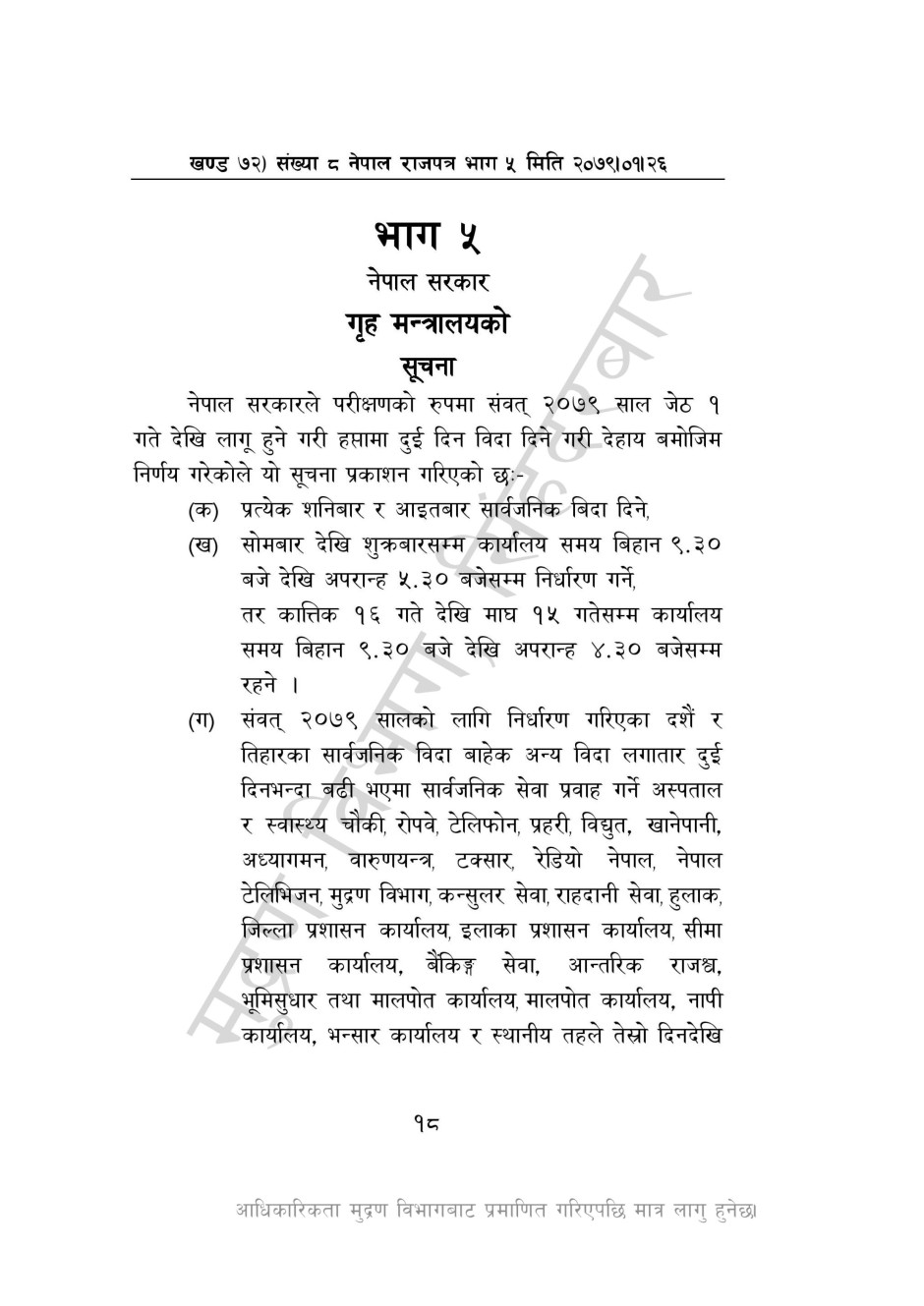 दुई दिन सार्वजनिक विदा सम्बन्धी गृह मन्त्रालयको सूचना