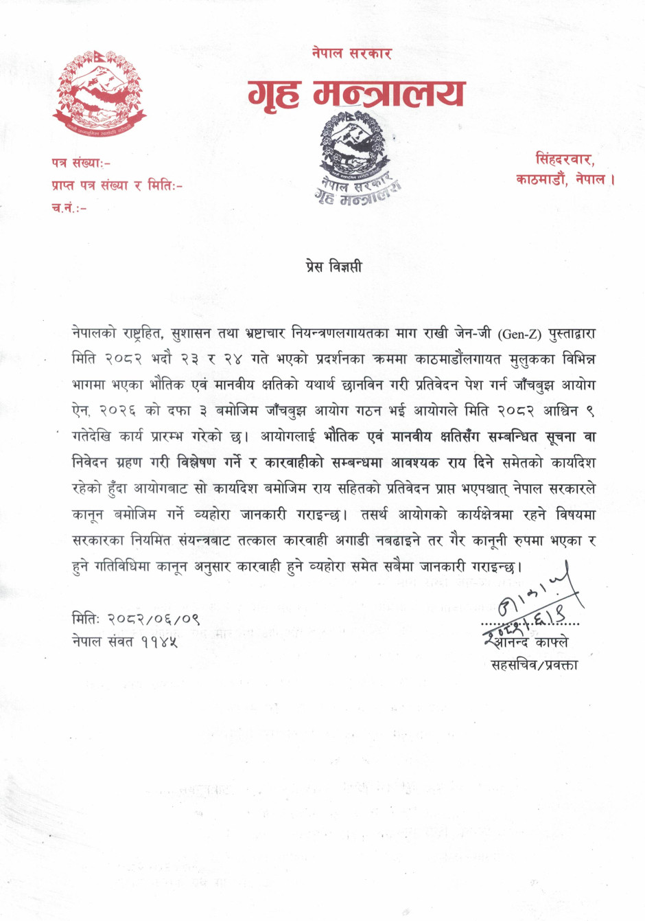 गृह मन्त्रालयसँग सम्बन्धित गुनासोका लागि सम्पर्क नम्बर