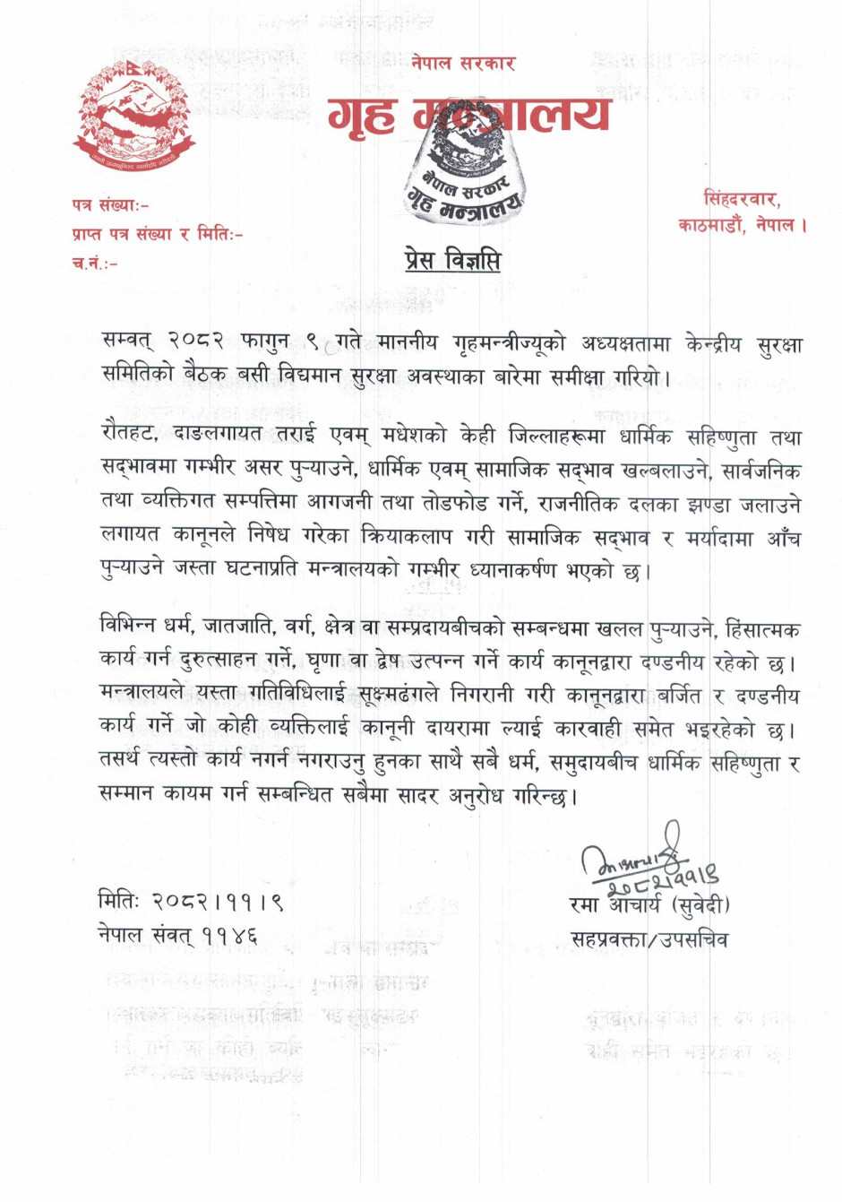 गृह मन्त्रालयसँग सम्बन्धित गुनासोका लागि सम्पर्क नम्बर