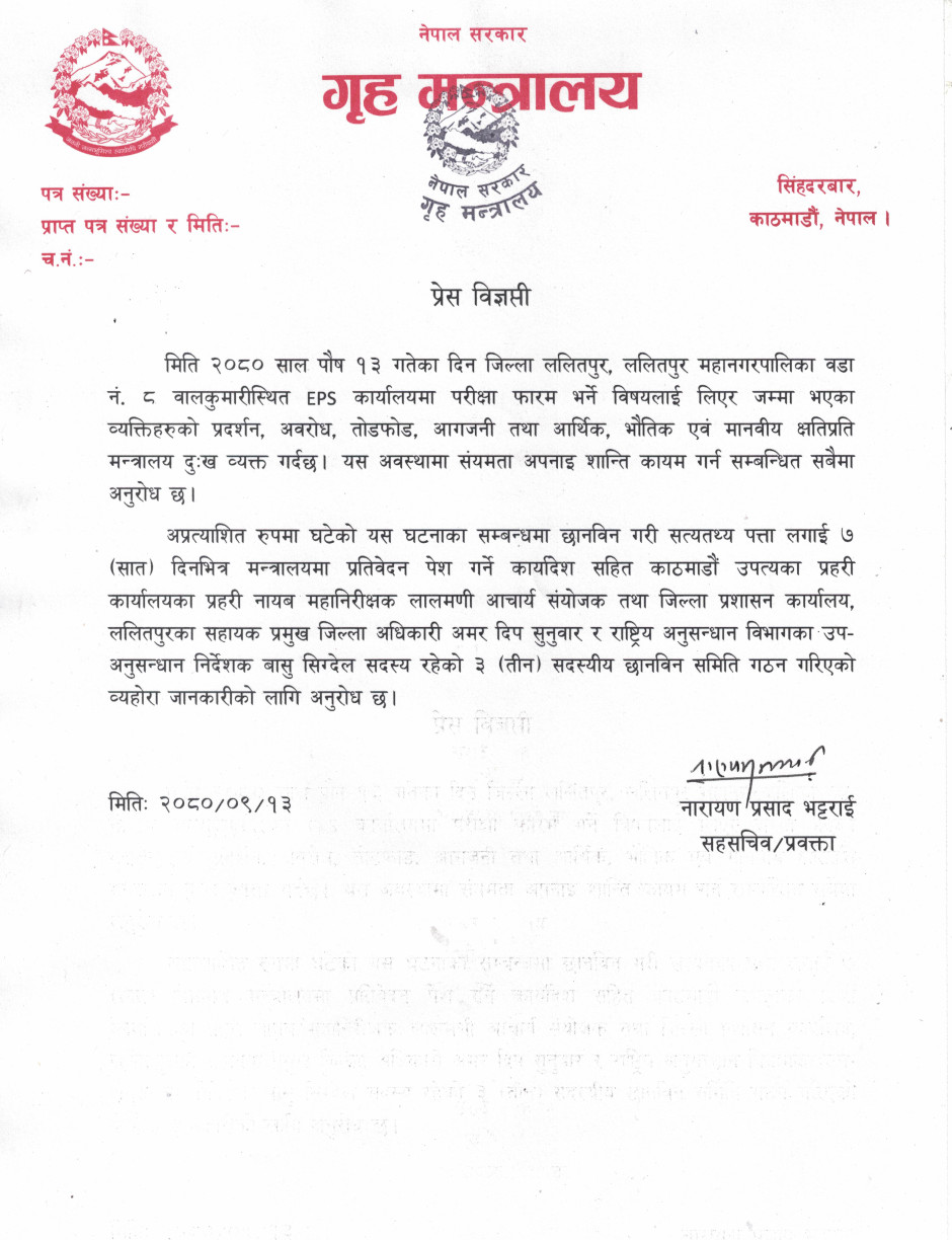 प्रेस विज्ञप्ति (वालकुमारी घटना छानविन समिति गठन सम्बन्धी)