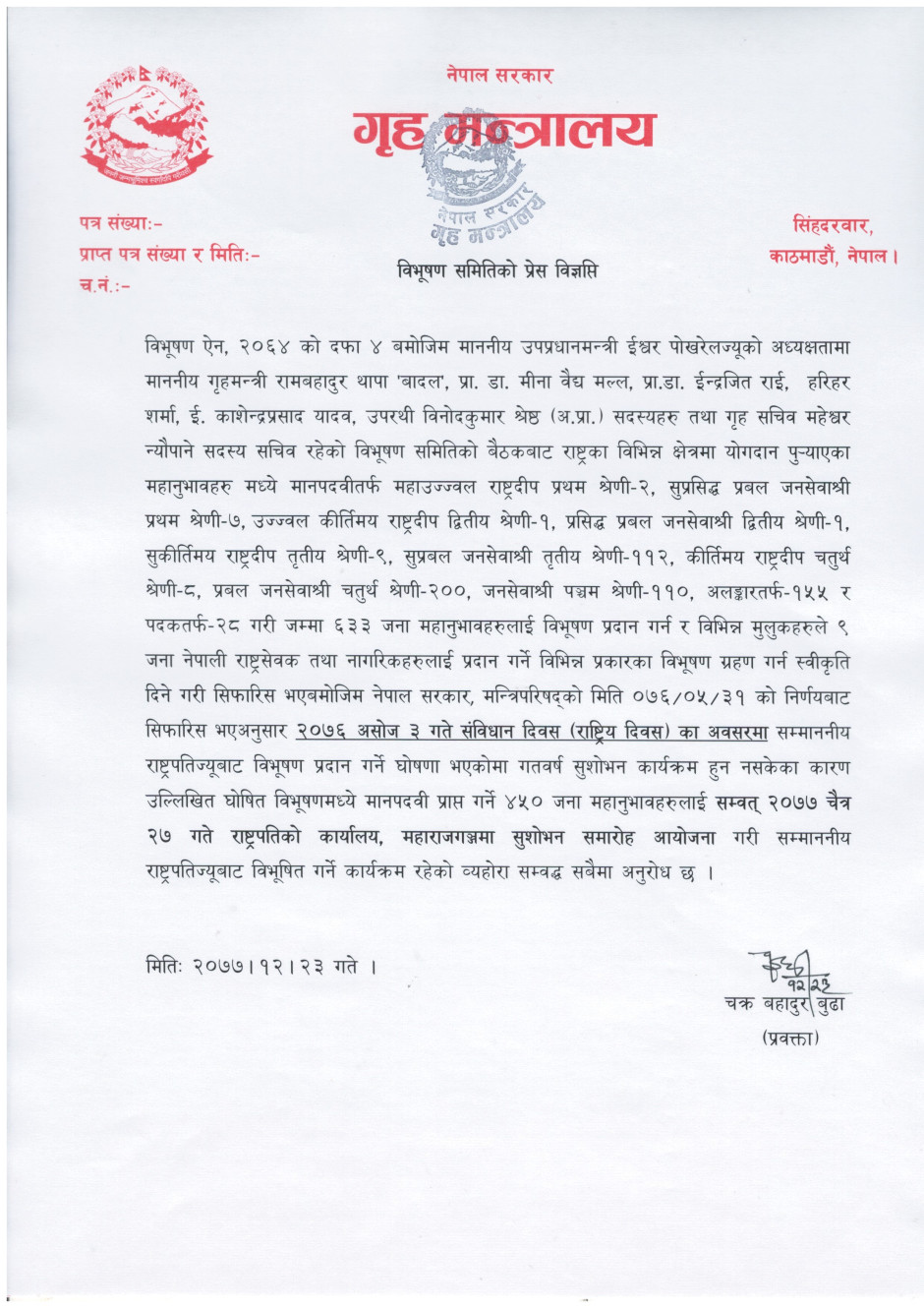 विभूषण समितिको प्रेस विज्ञप्ति