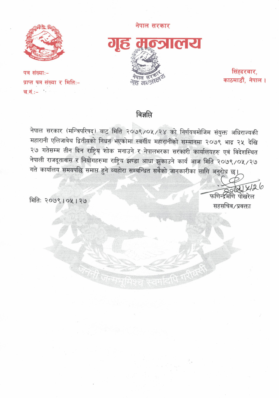 संयुक्त अधिराज्यकी स्व. महारानीको सम्मानमा शोक मनाउने समय समाप्त भएको सम्बन्धी प्रेस विज्ञप्ति