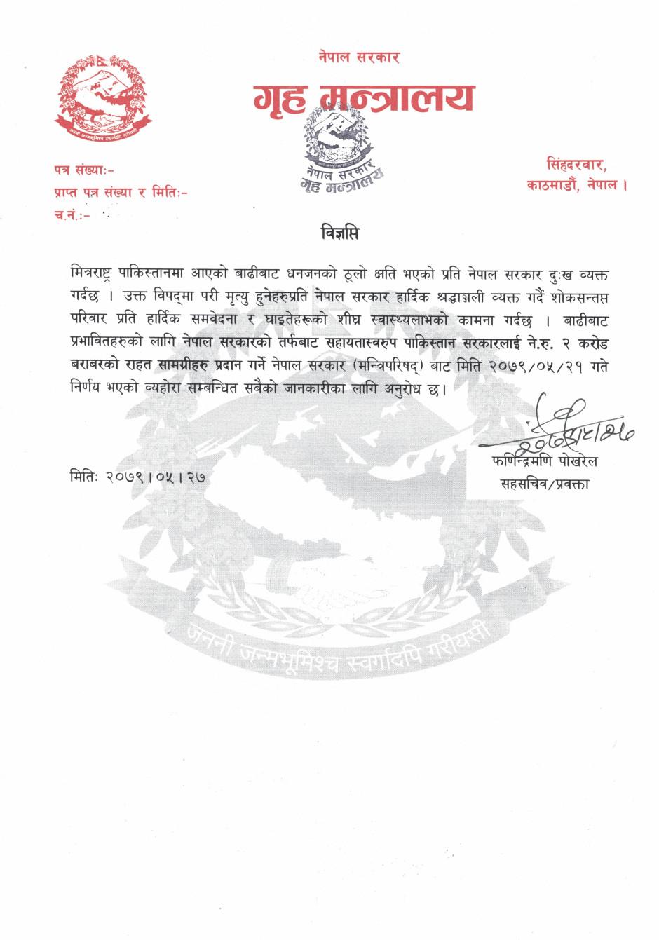 नेपाल सरकारको तर्फबाट पाकिस्तान सरकारलाई सहयोग सम्बन्धी प्रेस विज्ञप्ति