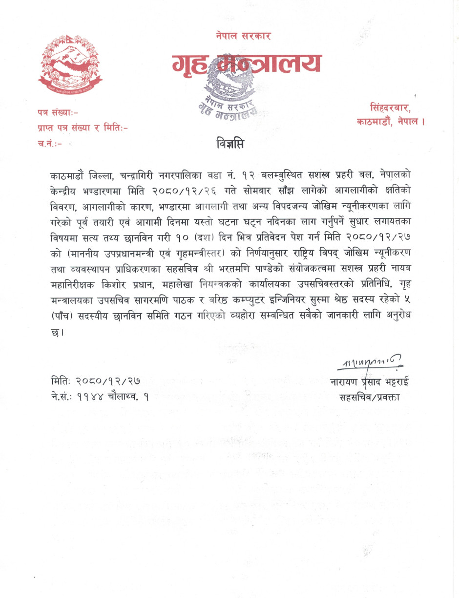 विज्ञप्ति (स.प्र. बल नेपालको भण्डारण कक्षमा भएको आगलागी सम्बन्धमा छानविन समिति गठन गरिएको)