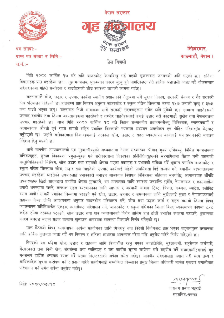 मिति २०८० कार्तिक १७ गते राति जाजरकोट केन्द्रबिन्दु भई गएको भूकम्प सम्बन्धमा प्रेस विज्ञप्ति