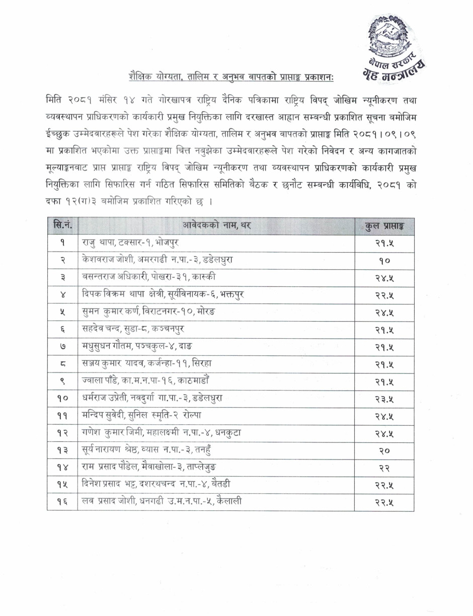 शैक्षिक योग्यता, तालिम र अनुभव वापतको प्राप्ताङ्क प्रकाशन (मिति २०८१।०९।१४)