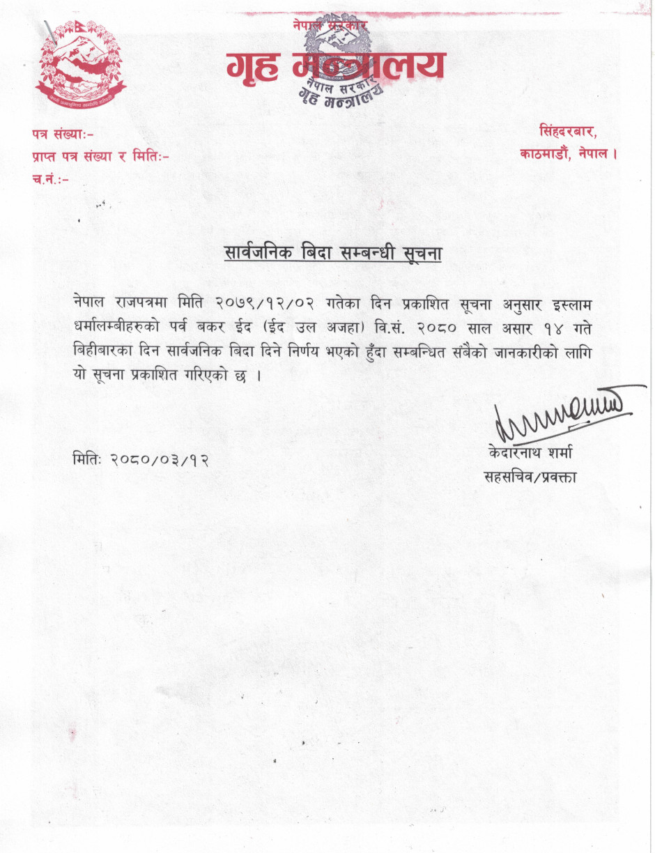 सार्वजनिक बिदा सम्बन्धी सूचना (बकर ईद (ईद उल अजहा) को अवसरमा)