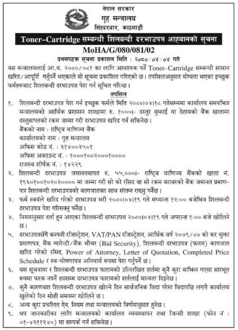 Toner-Cartridge सम्बन्धी शिलबन्दी दरभाउपत्र आव्हानको सूचना