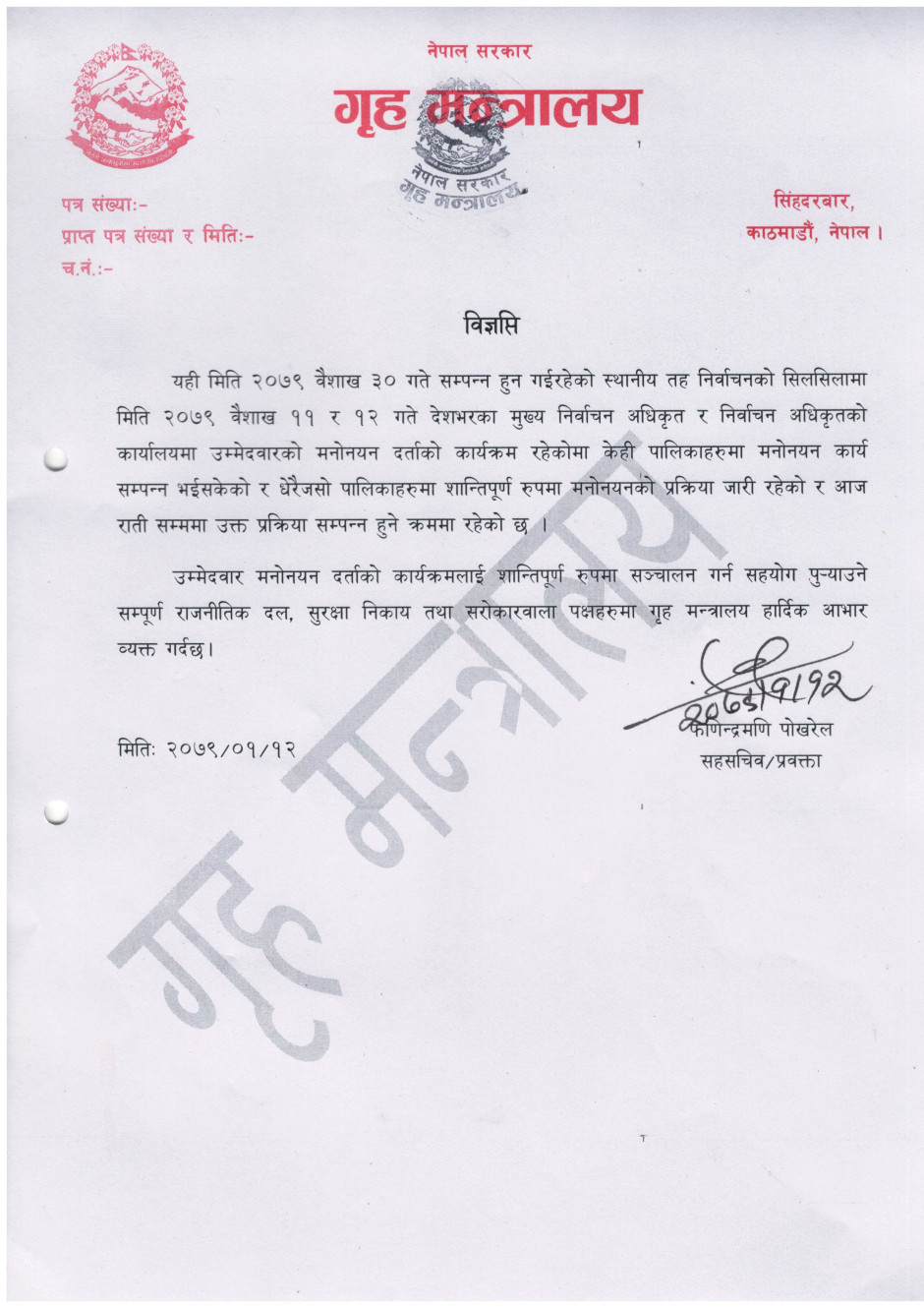 विज्ञप्ति (यही मिति २०७९ वैशाख ३० गते सम्पन्न हुन गईरहेको स्थानीय तह निर्वाचनको उम्मेदवार मनोनयन दर्ता सम्बन्धमा)